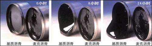 MAC??改性劑在瀝青中通過化學反應生成大量極性物質(zhì)并產(chǎn)生聚集,形成網(wǎng)狀格架結(jié)構(gòu),使瀝青的內(nèi)聚力大大增強,可生產(chǎn)出高粘度改性瀝青。同時由于瀝青極性的加強,使瀝青與集料表面的粘附性增強?;谏鲜鰞煞N原因,瀝青與集料膠結(jié)體系的膠結(jié)強度也隨之大大提高。MAC??改性瀝青呈凝膠狀,這種凝膠結(jié)構(gòu)使瀝青不會輕易移動,且其品質(zhì)穩(wěn)定,不會產(chǎn)生離析。室溫下,基質(zhì)瀝青或其他改性瀝青隨時間流逝而流動,而MAC??改性瀝青不隨時間而流動。