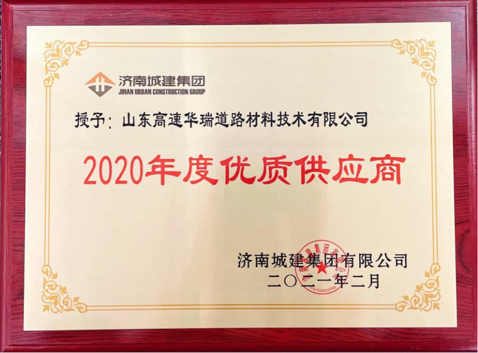 近日,山東高速華瑞道路材料技術(shù)有限公司榮獲濟南城建集團有限公司“2020年度優(yōu)質(zhì)供應(yīng)商”榮譽稱號,華瑞公司已連續(xù)五年獲此殊榮。