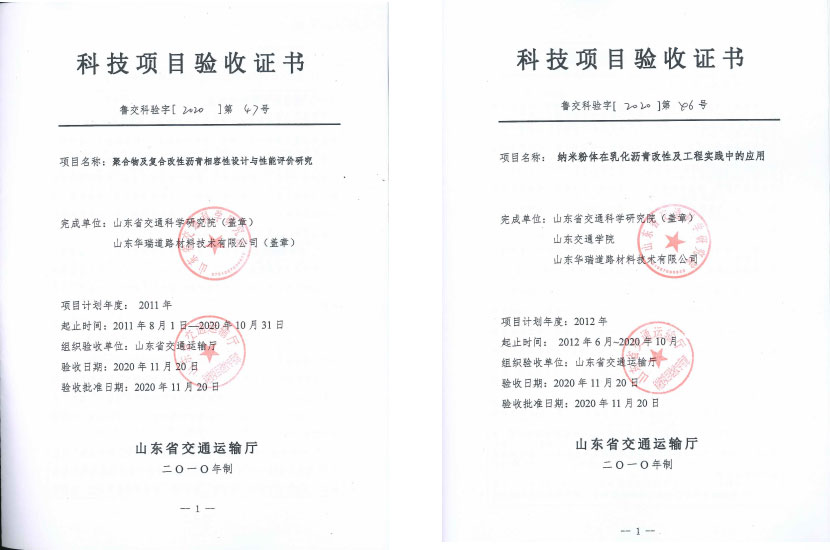 11月20日,華瑞公司與山東省交通科學研究院合作的《聚合物及復合改性瀝青相容性設計與性能評價研究》、《納米粉體在乳化瀝青改性及工程實踐中的應用》兩項科研項目順利通過山東省交通運輸廳組織的項目驗收和成果評價。