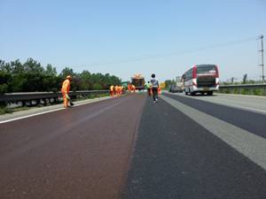 長深高速(濱州段)微表處養(yǎng)護維修工程山東省養(yǎng)護重點工程之一,上圖為濱州養(yǎng)護處正在進行微表處養(yǎng)護施工。施工后路面破乳時間短,路面強度上的快,減少了路面開放交通時間,得到了用戶的好評。