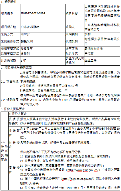 山東高速華瑞道路材料技術(shù)有限公司選取2022年度瀝青專用包裝袋供應(yīng)商項(xiàng)目詢比采購公告