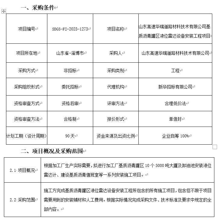 山東高速華瑞道路材料技術(shù)有限公司基質(zhì)瀝青罐區(qū)液位雷達(dá)設(shè)備安裝工程項(xiàng)目談判采購公告